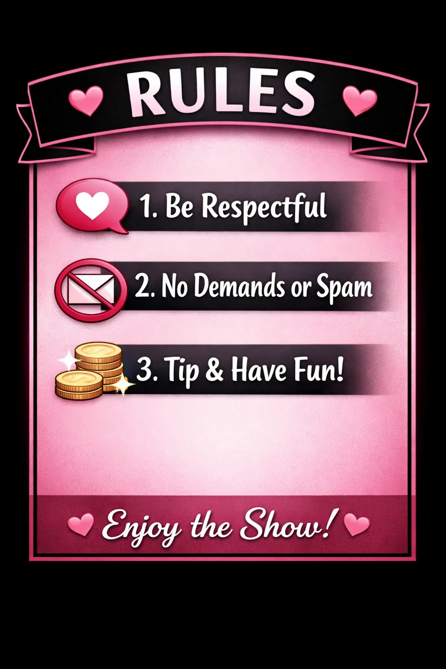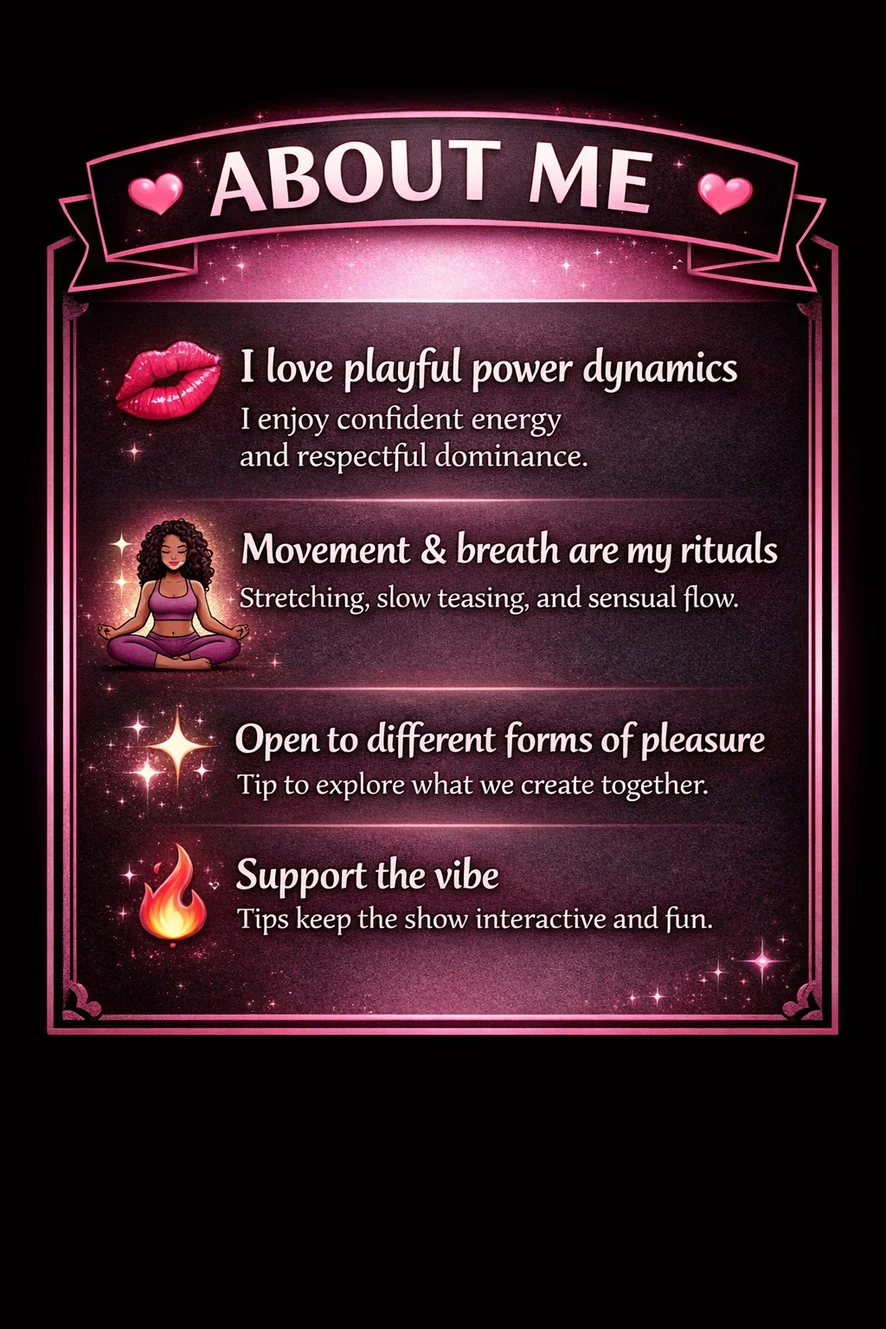 Dildo nebo vibrátor, Špinavá mluva, Erotický tanec, Prstění, Footfetish, Podpatky, Ponižování, Pokyny k masturbaci, Olejová show, Orgasmus, Sexuální hračky, Sprcha, Plácání po zadku, Ženský výstřik, Striptýz, Anál, Anální hračky, Vaření, Dvojitý průnik, Dávení, Dominy, Venku, Roleplay, Jóga, Zadkem k puse, Kuřba, Deepthroat, Latex, Hračky na bradavky, Pegging, Swing, Mezi kozy, Krátká sukně, Poloha 69